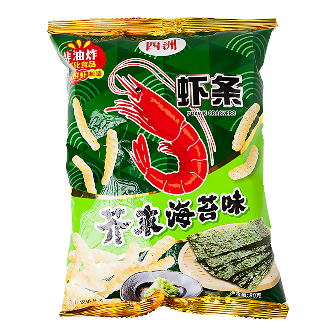FourSeas Prawn Crackers - Wasabi Seaweed Flavour offer an exciting twist on traditional prawn crackers. With the salty notes of seaweed and the spicy wasabi flavour, these crunchy snacks are perfect for those who love bold and unique flavours. Ideal as a snack, snack or with an Asian meal.
