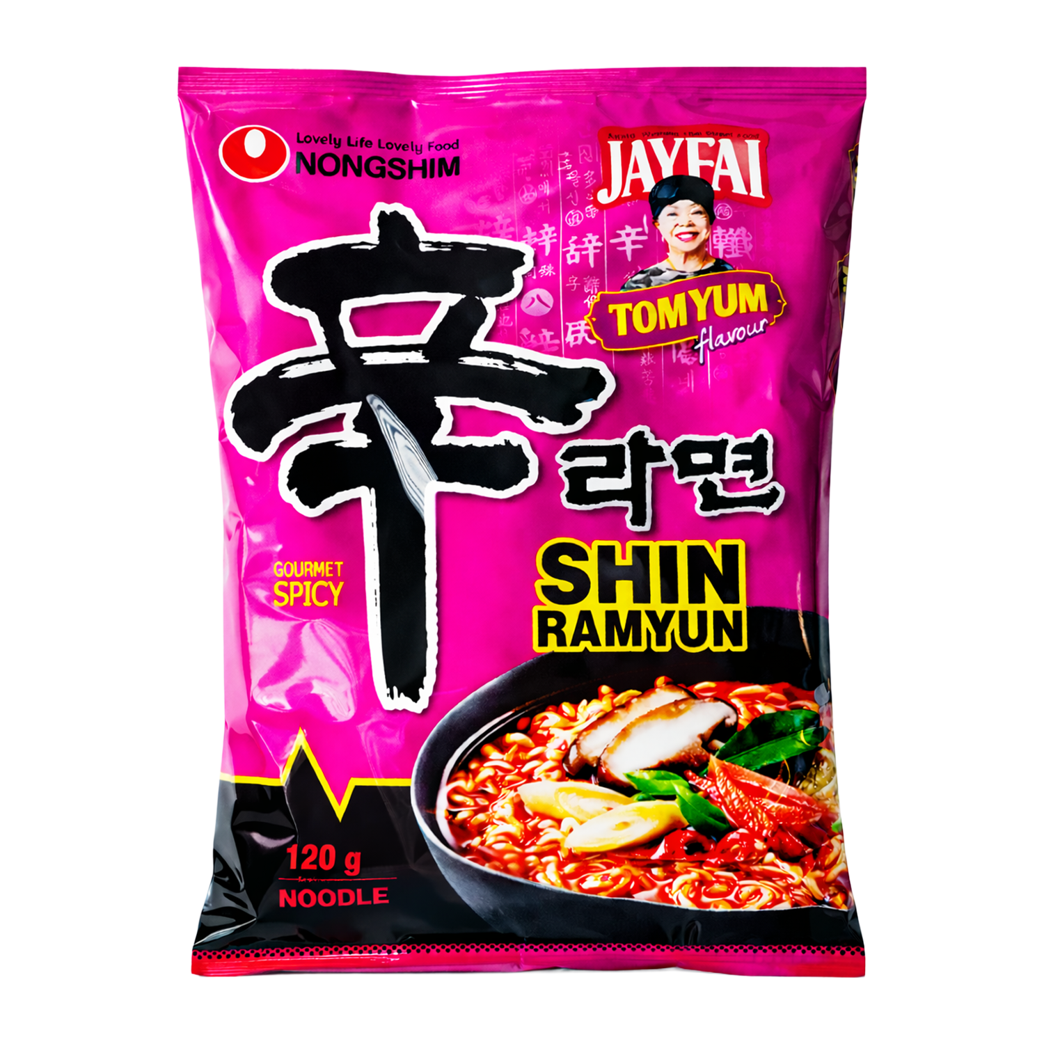 Nongshim's Tom Yum Shin Ramyun (Jay Fai Exclusive) is een samenwerking tussen de Koreaanse instant noedelfabrikant Nongshim en de beroemde Thaise chef-kok Jay Fai, bekend om haar Michelin-ster bekroonde streetfood.